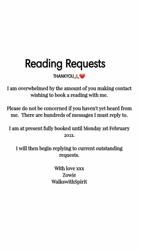 Reading Requests WalkswithSpirit Uncategorized January 22, 2021 1 Minute Share this:Tweet Click to share on WhatsApp (Opens in new window) WhatsApp Like Loading... Related Published by WalkswithSpirit Psychic Medium View all posts by WalkswithSpirit Published January 22, 2021
